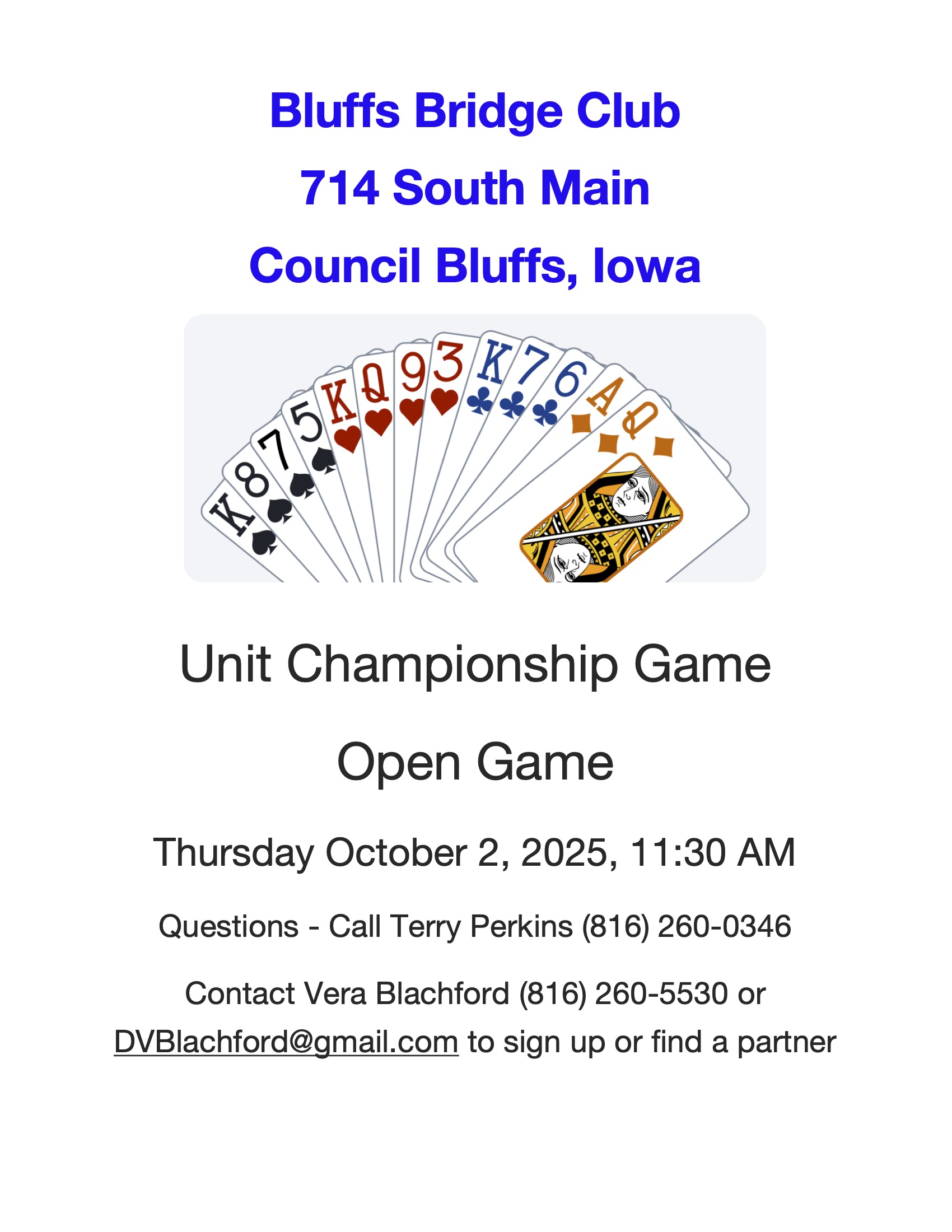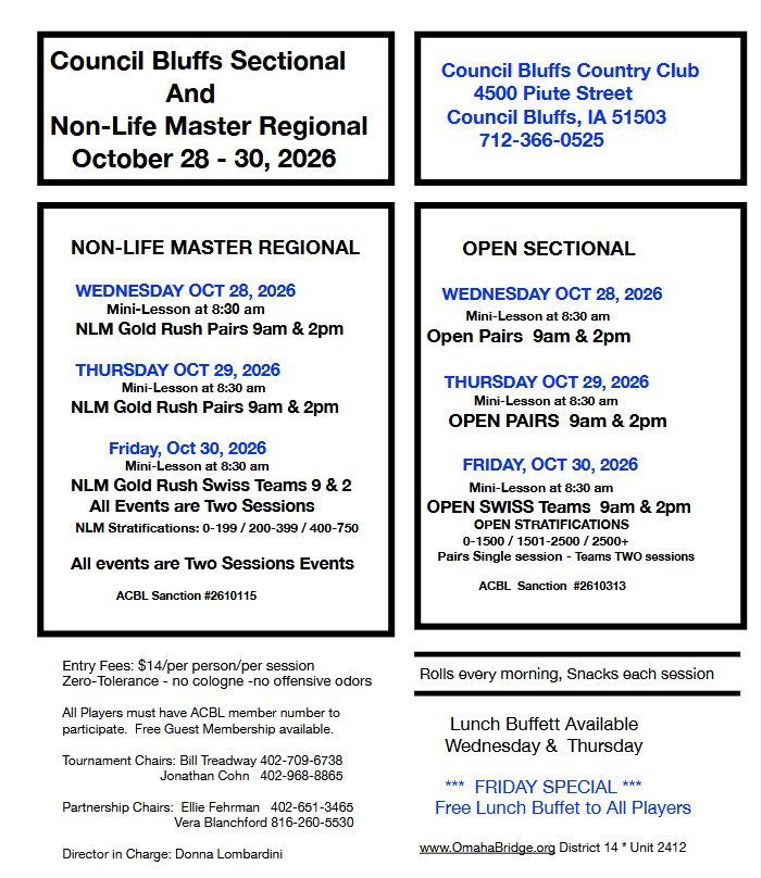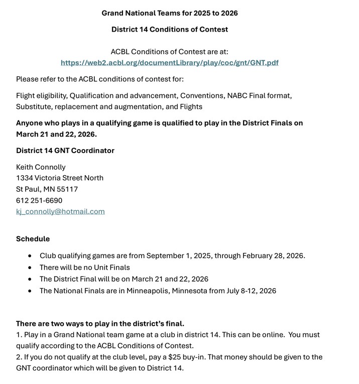 Dear Ambassador,Next July, the 2026 Summer NABC will be held in Minneapolis. The tournament PR Committee will be sending you emails throughout the year which we hope you will post at your club or clubs. That information will include hotels, restaurants, dining, parking, fundraising, theater, and sports. For September, the featured item is Name a Game (or Day) at the tournament. The person honored (named) could be someone from your club or area, a friend or a relative, a partner, a teacher, or someone close to you who passed away.