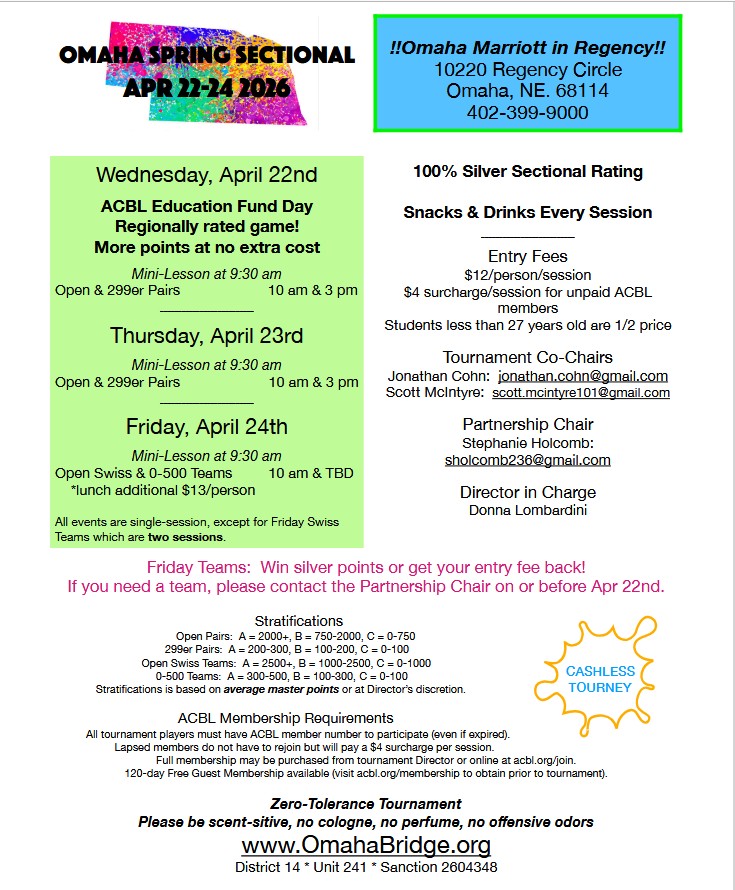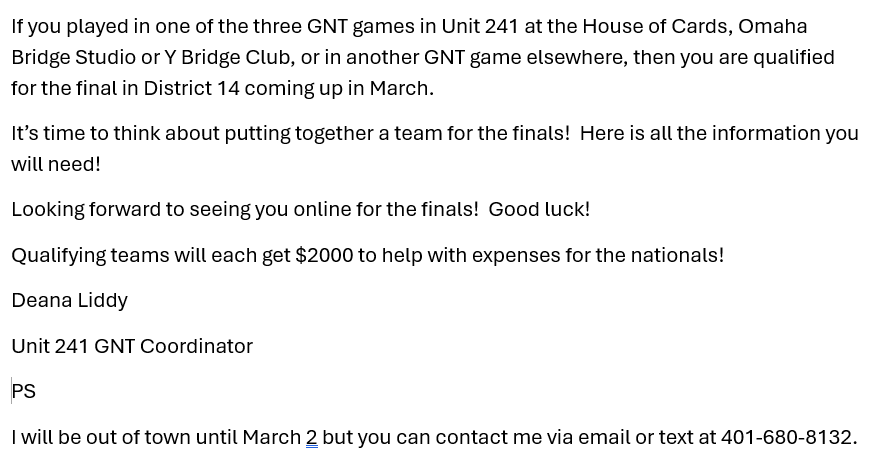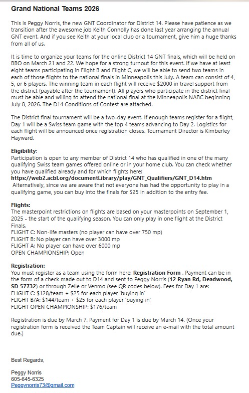 Dear Ambassador,Next July, the 2026 Summer NABC will be held in Minneapolis. The tournament PR Committee will be sending you emails throughout the year which we hope you will post at your club or clubs. That information will include hotels, restaurants, dining, parking, fundraising, theater, and sports. For September, the featured item is Name a Game (or Day) at the tournament. The person honored (named) could be someone from your club or area, a friend or a relative, a partner, a teacher, or someone close to you who passed away.