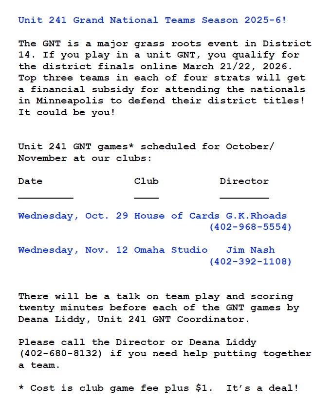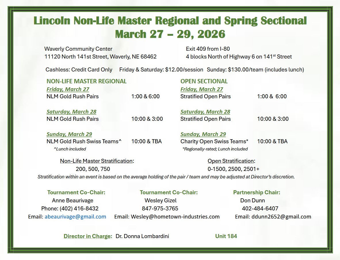 Next July, the 2026 Summer NABC will be held in Minneapolis. The tournament PR Committee will be sending you emails throughout the year which we hope you will post at your club or clubs. That information will include hotels, restaurants, dining, parking, fundraising, theater, and sports. For September, the featured item is Name a Game (or Day) at the tournament. The person honored (named) could be someone from your club or area, a friend or a relative, a partner, a teacher, or someone close to you who passed away.